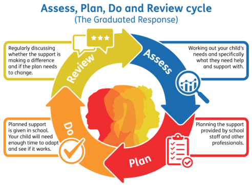 We use a graduated response of Assess, Plan, Do, Review. Teachers and the SENCo work closely with parents to identify needs early, monitor progress, and put appropriate support in place. External agencies are involved when needed.